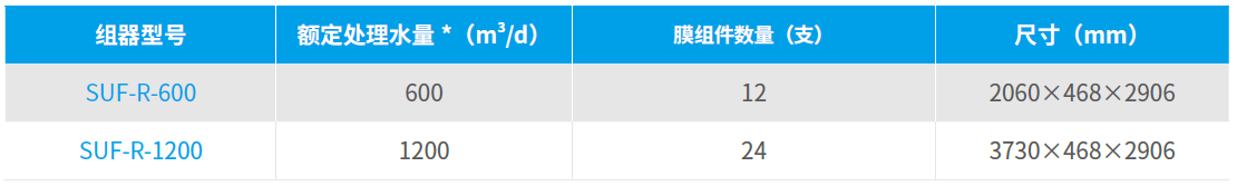 SUF 浸沒式超濾膜組器由不同數量的浸沒式超濾膜組件組成,可根據用戶需求進行靈活配置,結合開放式流道和一體化曝氣結構設計,具有產水水質好、抗污染性強等特點。該產品是國家“十二五”水專項重大成果之一,入選“國家火炬計劃項目”、“國家鼓勵發展的重大環保技術裝備”,獲得“中關村新技術新產品”、“北京市新技術新產品”等榮譽。