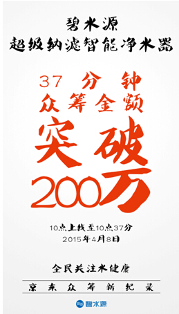 這次,碧水源利用京東眾籌這樣一種時下火熱的、嶄新的形式來發(fā)布其首款智能納濾凈水產(chǎn)品,不僅僅在于推廣、銷售產(chǎn)品。更重要的是面對紛繁凌亂、良莠不齊的凈水器市場,碧水源的一次正身立言,規(guī)范市場,為用提供真正的健康好水。事實上,市場也回報了碧水源極大的熱情,D506短短37分鐘突破200萬的記錄就是最好的證言。并且,眾籌金額還在不斷攀升,我們在期待這款高端凈水器走人更多人們生活的同時,也期待碧水源的產(chǎn)能可以跟得上用戶和市場的需求。