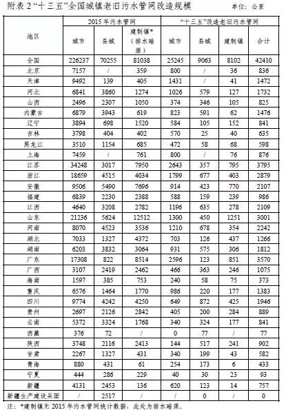 新增污水管網13.44 萬公里,老舊污水管網維修4.24 萬公里,雨污合流管網改造3.89 萬公里,新增污水處理設施規模4890 萬立方米/日,提標改造污水處理設施規模4053 萬立方米/日,新增污泥(以含水80%的污泥計)處理處置規模6.31 萬噸/日,新增再生水利用設施規模2113 萬立方米/日,新增初期雨水治理設施規模1016 萬立方米/日,完善國家、省、市三級排水監管平臺,形成全國統一、全面覆蓋的城鎮排水與污水處理監管體系。