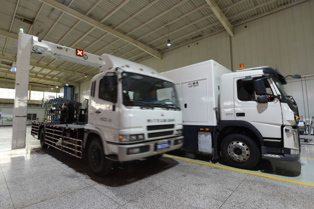 4月20日,同方威視的工作人員在演示車載式集裝箱檢查系統,被檢車輛穿“拱門”而過,整臺車的安檢圖像就可以顯示在屏幕上。(新華社記者 鞠煥宗 攝)