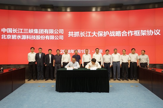 文劍平表示,三峽集團是世界可再生清潔能源開發利用的先鋒,成功治理了長江水患,目前又致力于反哺母親河,改善長江水質,對三峽集團履行央企社會責任中作出的貢獻表示欽佩。保護長江、愛護母親河是中華民族炎黃子孫的共同責任,實施長江大保護工作極具歷史遠見和現實意義,碧水源非常期待參與到這個偉大事業中。目前,碧水源在長江經濟帶沿線已建成數十個城鎮污水處理項目、上百座村鎮污水處理設施,日處理污水達400多萬噸,出水水質可達到地表水IV類標準。未來,碧水源將發揮技術、管理和人才優勢,為三峽集團長江大保護工作提供全方位支撐。